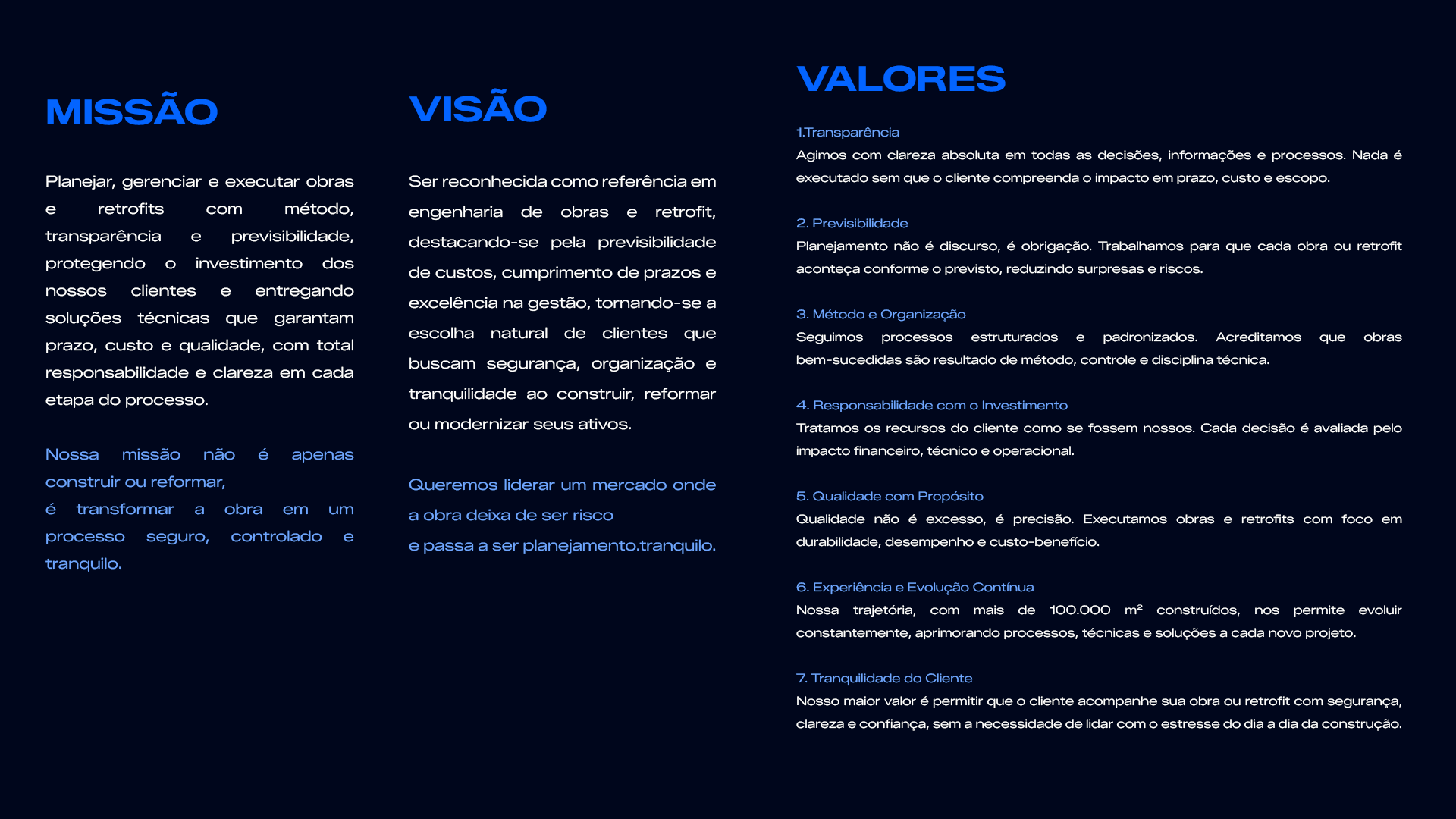 * Usar o acervo técnico (100.000 m²) como prova concreta, não apenas como número.